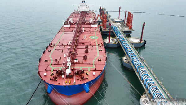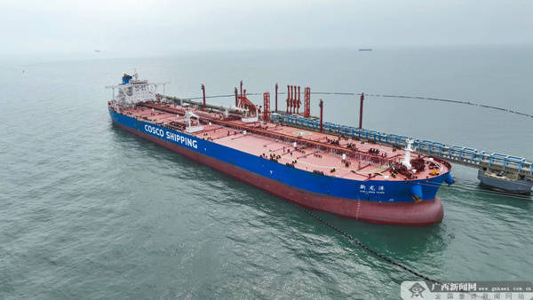 3月19日,装载25.4万吨中东原油的“新龙洋”轮在广西钦州30万吨原油码头靠泊作业。蒋瑞卿摄