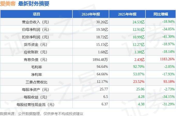 据证券之星公开数据整理,近期爱美客(300896)发布2025年年报。截至本报告期末,公司营业总收入24.53亿元,同比下降18.94%,归母净利润12.91亿元,同比下降34.05%。按单季度数据看,第四季度营业总收入5.88亿元,同比下降9.61%,第四季度归母净利润1.98亿元,同比下降46.85%。本报告期爱美客三费占比上升明显,财务费用、销售费用和管理费用总和占总营收同比增幅达93.18%。