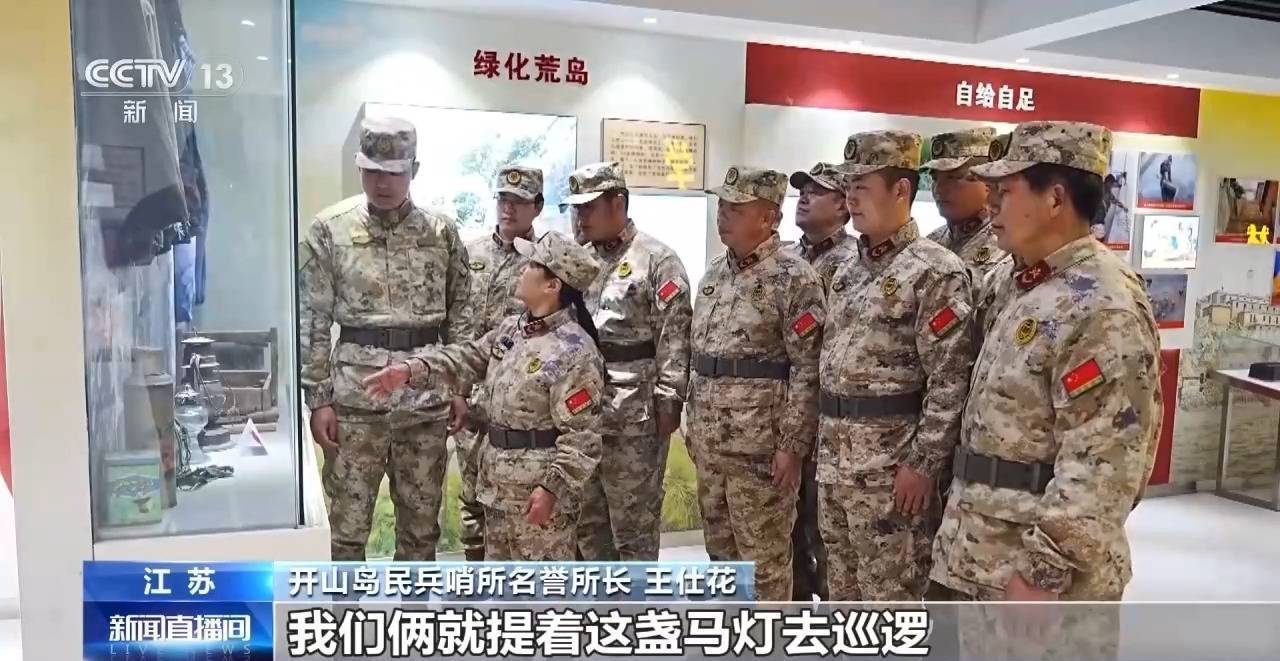 r国旗下,时代楷模、开山岛民兵哨所名誉所长王仕花与民兵代表一起,轻轻擦拭着王继才的铜像,大家敬献鲜花,肃立默哀。展馆内,王仕花向守岛民兵们讲述当年王继才与她的守岛点滴。